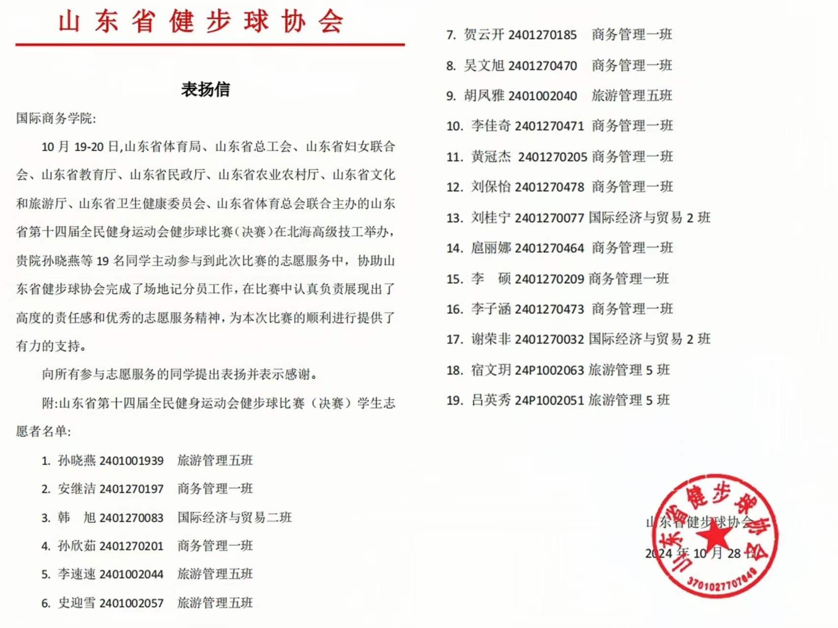 近日,我院收到来自山东省健步球协会的感谢信,对参与山东省第十四届全民健身运动会健步球比赛决赛志愿服务的19名学生给予高度赞扬和肯定。