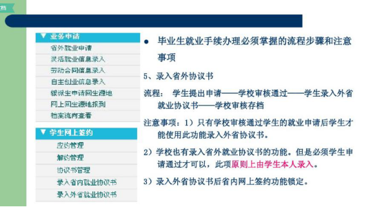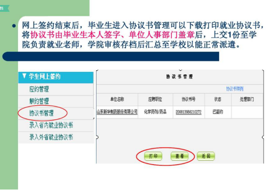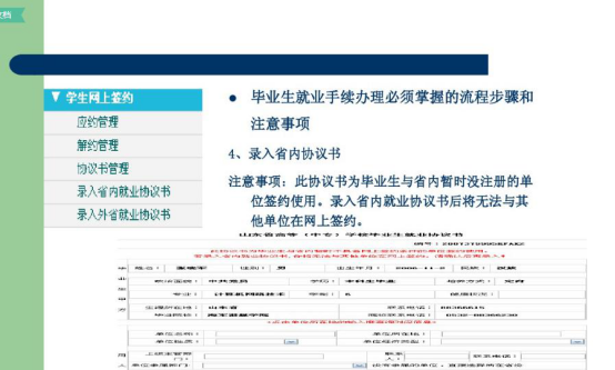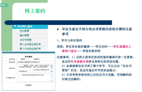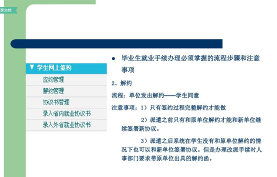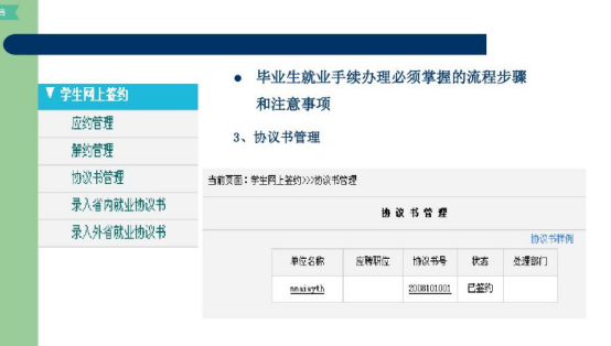 在此,特向毕业生提几点建议以供参考:第一,签协议前,毕业生一定要全方位地了解用人单位的相关情况。例如企业的发展趋势、企业招聘的岗位性质、企业的员工培养制度、待遇状况、福利项目等系列内容,不但要掌握资料,更要实地考察。并且还需要重点了解单位的人事状况,了解企业是否具有应届毕业生的接收权。第二,毕业生在签约时要按照正常程序进行。毕业生持用人单位的接收函到院系领取就业协议书,先由毕业生、院系在协议书上签署意见后交用人单位,由用人单位签署意见后再交给学校,学校签字后纳入就业计划,协议书生效。有的毕业生为省事,要求学校先签署意见,但这样做使学校无法起到监督、公正的作用,最可能受害的将是毕业生本人。第三,签署协议书时,一定要认真、真实地填写协议书内容。如果报考了研究生或准备出国,应事先向用人单位说明,并在协议书中注明。以往有毕业生向用人单位隐瞒这些情况,而后遭到违约处理。第四,毕业生在签约时也要考虑对自身权益的保护。协议具有双向约定的作用,如果有双方需要相互承诺的部分,一定要在协议书或补充协议上加以说明。就业协议中可以规定违约金的数额,根据现行劳动法规中规定的上限是12个月的工资总和。第五,毕业生在签约中,一定要注意条款的合理性。我国劳动法明确规定,用人单位不得以任何理由,向毕业生收取报名费、培训费、押金、保证金等,并以此作为是否录用的决定条件。第六,毕业生、用人单位双方都不得单方面拖延签约周期。毕业生遇到问题而犹豫不决时,最好能够及时咨询高校就业部门负责老师,征求相关的意见和指导。第七,签订就业协议书后,一定要签署劳动合同。正式的劳动合同可能是学生毕业前签订、毕业后生效的,也可能是毕业后签订、立即生效的。一般就业协议书也会在劳动合同生效时,而终止其效力。